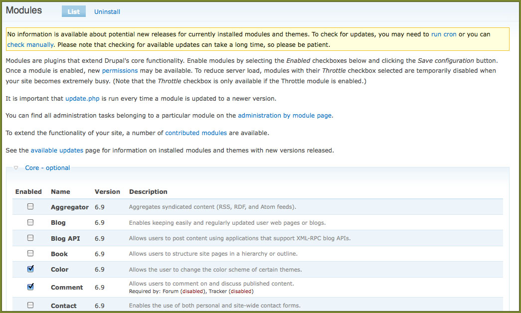 The use of modules allows almost any required feature to be added into the system. The most common of these come pre installed.