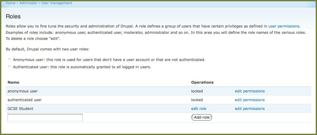 This is accomplished by the use of roles. The method used in implementing roles is very similar to the work I did during my placement year using the Blackboard system. The first task I needed to do was set up the different roles, if I find a need for more in the future then they can be added in as well. For now I have created the role for a GCSE Student.