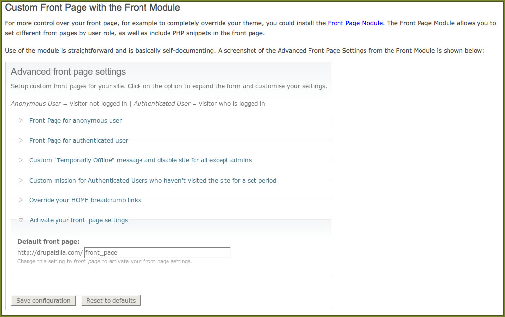 The first module I have installed is the ‘Custom Front Page’ module. This basically allows me to create a front page to the site using a different theme to the rest of the system. This is important, as what a guest user sees, should be different to what a user has access to once they have logged in. The home page to the site is more of a selling point so needs to be designed to focus on that task. The Front Page Module allows me to adjust the setting as much as I need, it even allows for the front page to be completely coded from scratch.