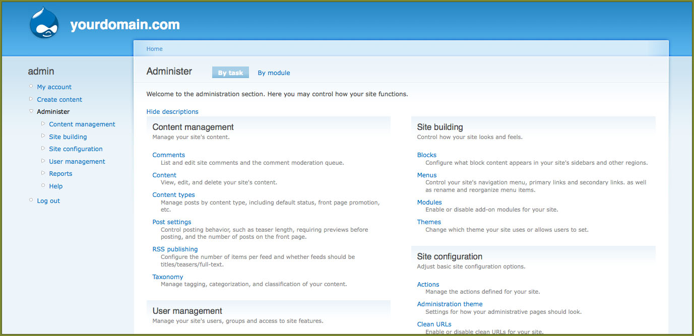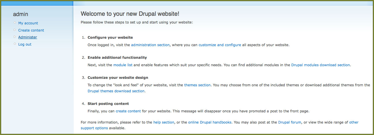 I’ve started working through the basic system settings and trying to get a feel for using the system. From what I have seen so far the systems seems to be very powerful and allows much customization. On top of the default system content you can add many other modules and themes created by other users, or created yourself.