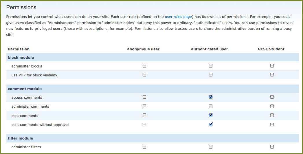 This is accomplished by the use of roles. The method used in implementing roles is very similar to the work I did during my placement year using the Blackboard system. The first task I needed to do was set up the different roles, if I find a need for more in the future then they can be added in as well. For now I have created the role for a GCSE Student.