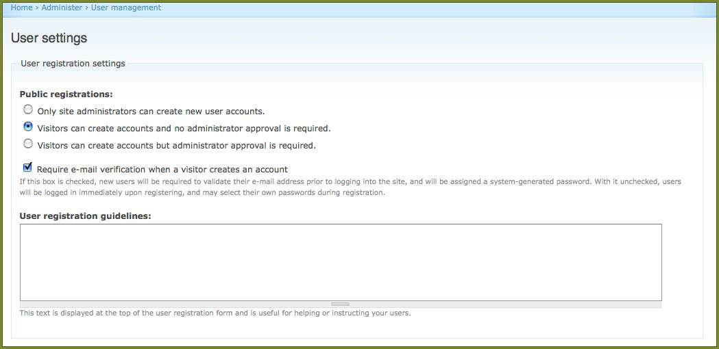 Since the system will be publicly available, I have set it up to enable anyone to register without requiring administrative permission. I may need to change theses settings in the future as I have not properly investigated the registration process I am going to require.